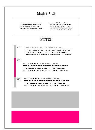- and, at the end, an excursus, or article, on a topic of interest for that chapter or the Gospel of Mark, that is meant to argue, inform, or stimulate (pink area).